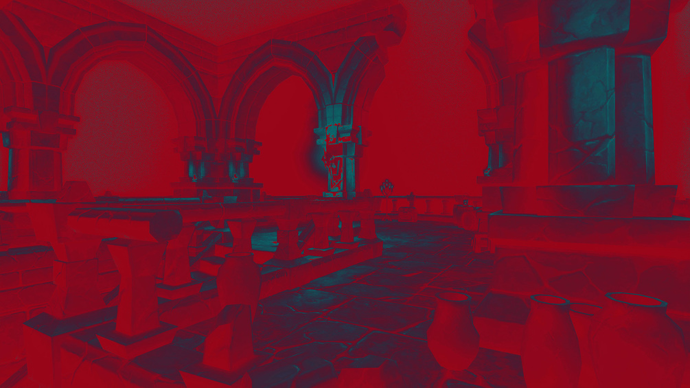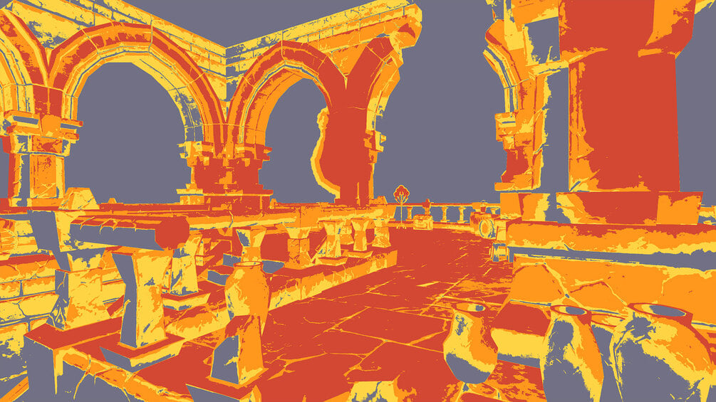 This gradient map post process shader has been created in Unreal Engine. The shader is interactive through exposed material parameters, which allow the developer to modify various properties.